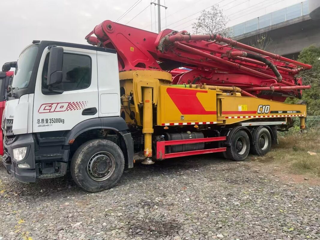 Spesifikasi: Model SYM5353THB 520C-10 dengan boom 52m, output 80.000+ m³, sasis Mercedes 2020, memenuhi standar emisi China Stage V, 1600 jam kerja, jarak tempuh 23.000 km.